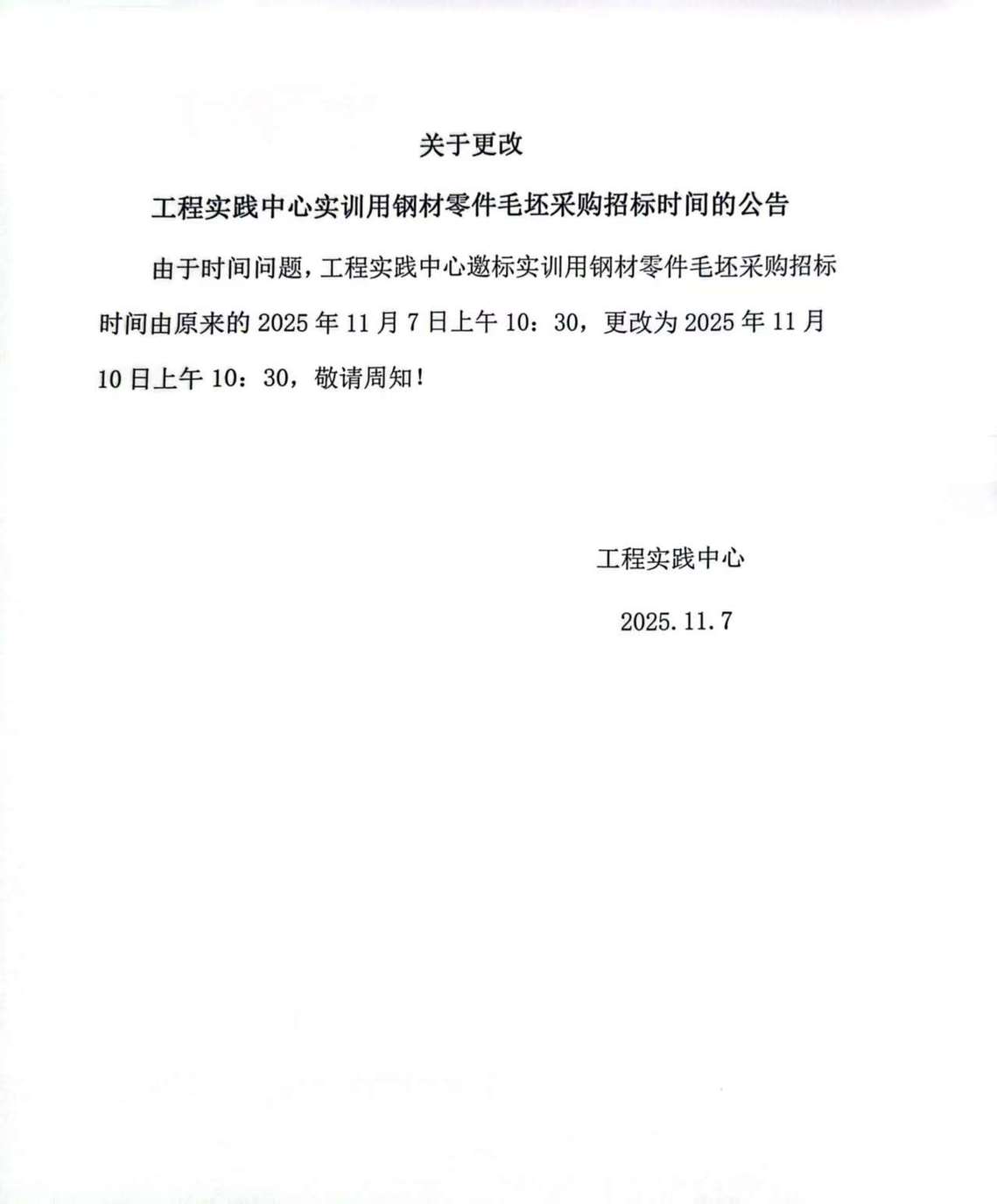 关于更改 工程实践中心实训用钢材零件毛坯采购招标时间的公告